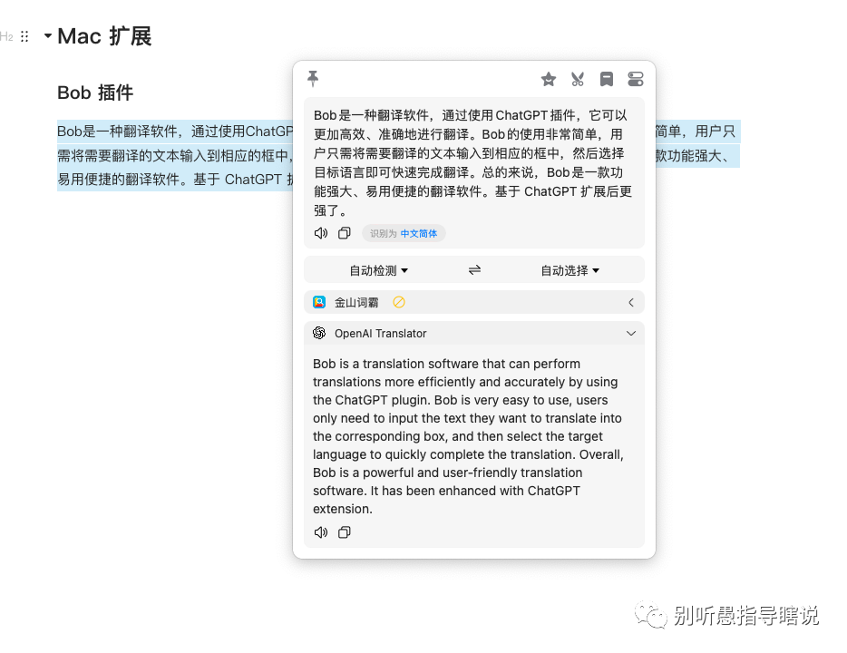 Bob 是一种翻译软件,通过使用 ChatGPT 插件,它可以更加高效、准确地进行翻译。Bob 的使用非常简单,用户只需将需要翻译的文本输入到相应的框中,然后选择目标语言即可快速完成翻译。总的来说,Bob 是一款功能强大、易用便捷的翻译软件。基于 ChatGPT 扩展后更强了。